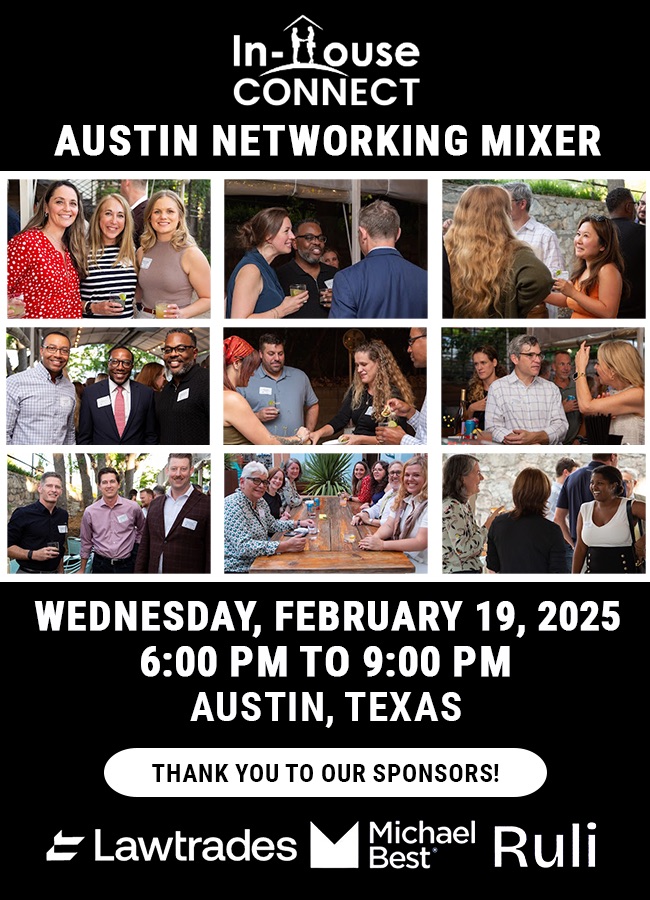 In-House Connect is thrilled to announce that we are hosting a networking mixer in Austin, Texas on Wednesday, February 19, 2025, from 6pm-9pm! We will have drinks, dinner, and fantastic networking!