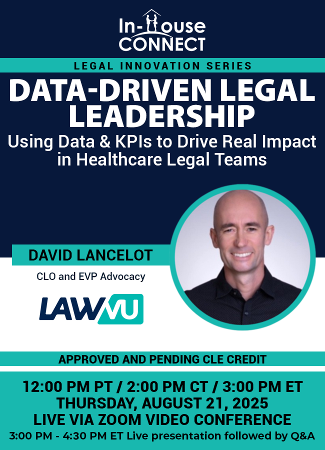 FREE LIVE CLE CREDIT IS ONLY AVAILABLE FOR IN-HOUSE COUNSEL (FRACTIONAL GCs, GOVERNMENT ATTORNEYS, & ALSP ATTORNEYS INCLUDED) AND SUBSCRIBERS TO IN-HOUSE CONNECT ON-DEMAND.