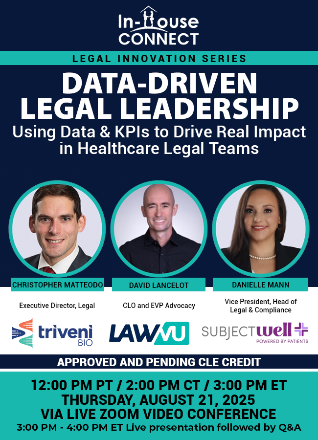 Join us on Thursday, August 21 at 3pm ET as David Lancelot, Chief Legal Officer and EVP of Advocacy at LawVu, Christopher Matteodo, Executive Director, legal at Triveni Bio, and Danielle Mann, Vice President, Head of Legal & Compliance at SubjectWell, Inc, will share practical strategies to help in-house healthcare lawyers embrace a data-driven mindset. You’ll learn how to leverage legal KPIs, benchmarks, and storytelling to elevate your department’s visibility and influence.