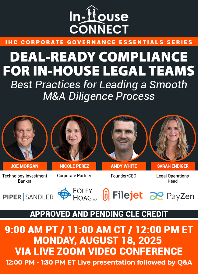 In this session, you’ll hear from experts across investment banking, corporate law, and legal operations as they share how in-house legal teams can proactively prepare for M&A. From aligning internal stakeholders to streamlining entity documentation and anticipating buyer requests, you’ll gain practical strategies to help your team show up organized, informed, and ready to lead.