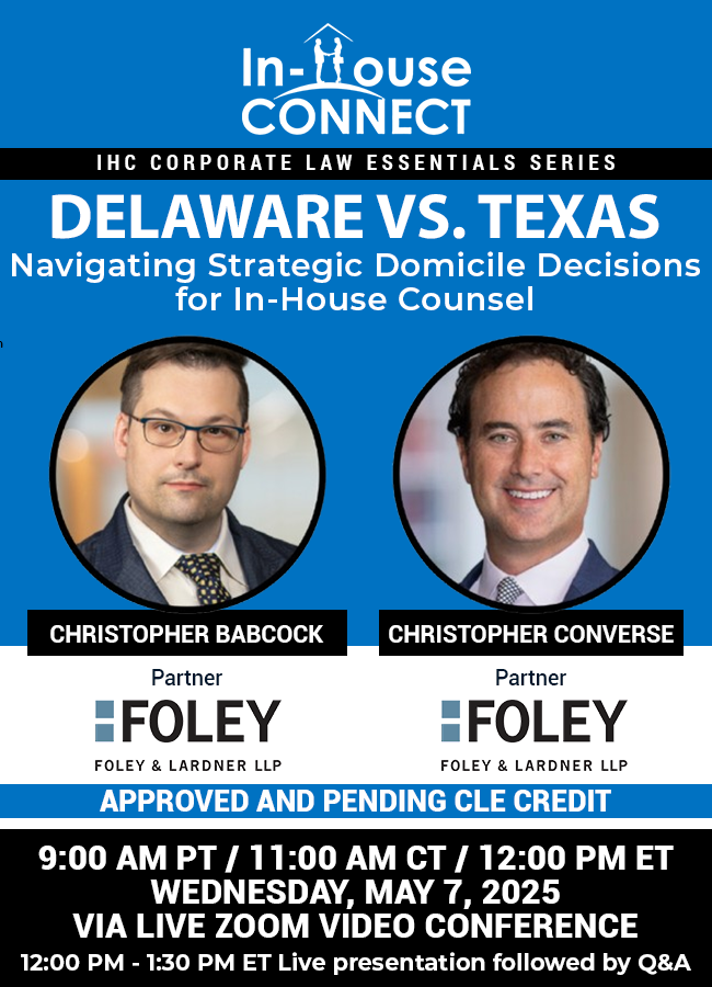 Join us on Wednesday, May 7, 2025, at 12pm ET / 9am PT as Chris Converse and Chris Babcock, of Foley, explore the latest changes in Delaware and Texas corporate law. Drawing from their direct involvement in shaping Texas’s recent legislative updates, they’ll provide an inside look at what’s changing, what’s coming, and how to assess whether a move from Delaware to Texas—or vice versa—makes sense for your company.