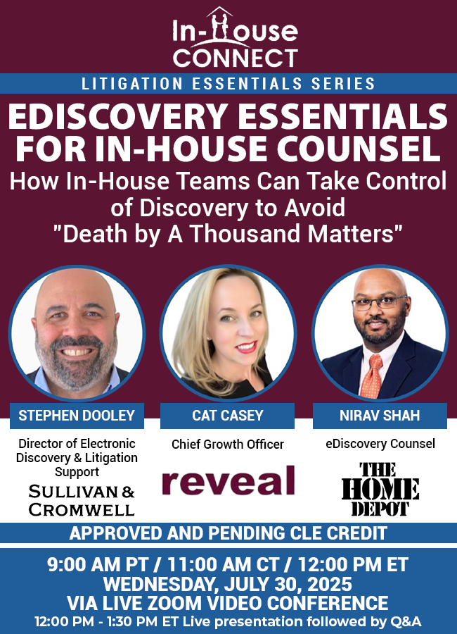 This program is FREE thanks to our gracious sponsor, Reveal! If you can’t attend the live program, the recording will be available for viewing via our paid CLE library, In-House Connect On-Demand!