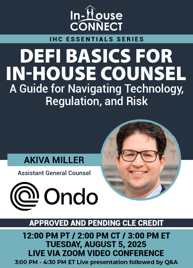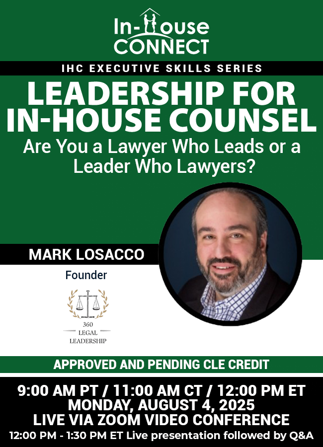 FREE LIVE CLE CREDIT IS ONLY AVAILABLE FOR IN-HOUSE COUNSEL (FRACTIONAL GCs, GOVERNMENT ATTORNEYS, & ALSP ATTORNEYS INCLUDED) AND SUBSCRIBERS TO IN-HOUSE CONNECT ON-DEMAND