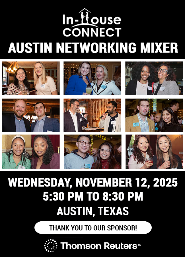 In-House Connect is excited to announce that we are hosting a Networking Mixer in Austin on Wednesday, November 12, 2025, from 5:30 pm to 8:30 pm! Join IHC Austin Chapter Hosts Sarah McElvaney, Ryan Clark, Robyn Glassner and 80+ in-house legal professionals for a wonderful evening of drinks, dinner, and fantastic networking with in-house legal professionals!