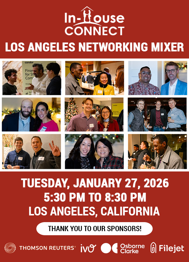 In-House Connect is excited to announce that we are hosting a Networking Mixer in Downtown Los Angeles on Tuesday, January 27, 2026, from 5:30 pm to 8:30 pm! Join 70+ in-house legal professionals for a wonderful evening of drinks, dinner, and fantastic networking with in-house legal professionals!