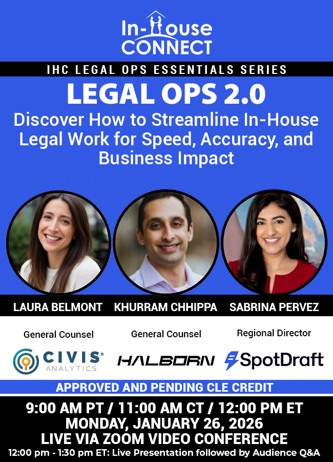 This program is FREE, thanks to our gracious sponsor, Spotdraft! Contract management at the speed of business! If you can’t make it to the live program, the recording will be available for viewing via our paid CLE library, In-House Connect On-Demand!