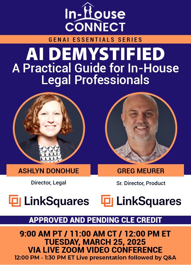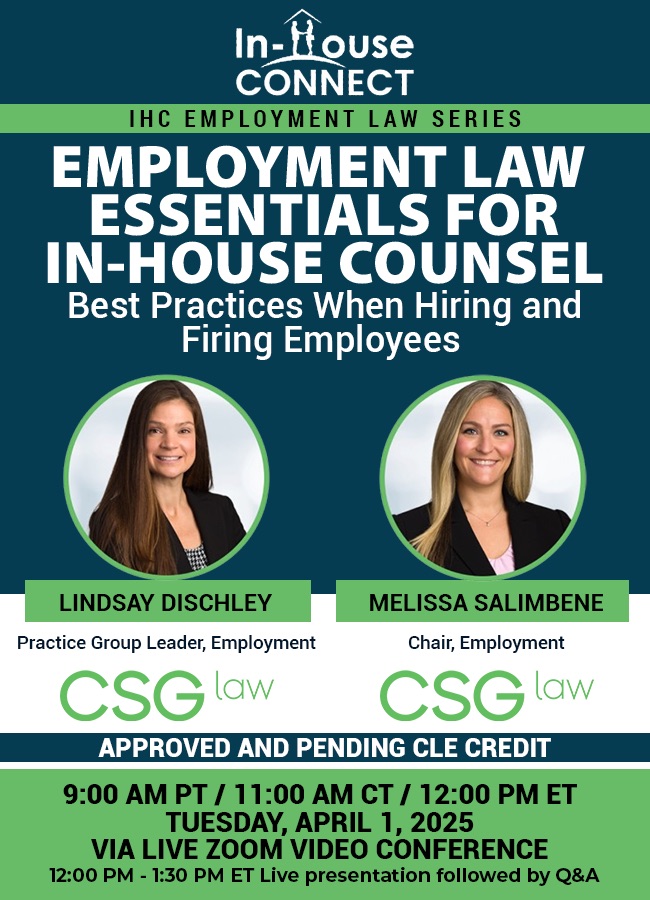 FREE LIVE CLE CREDIT IS ONLY AVAILABLE FOR IN-HOUSE COUNSEL (FRACTIONAL GCs, GOVERNMENT ATTORNEYS, & ALSP ATTORNEYS INCLUDED) AND SUBSCRIBERS TO IN-HOUSE CONNECT ON-DEMAND.