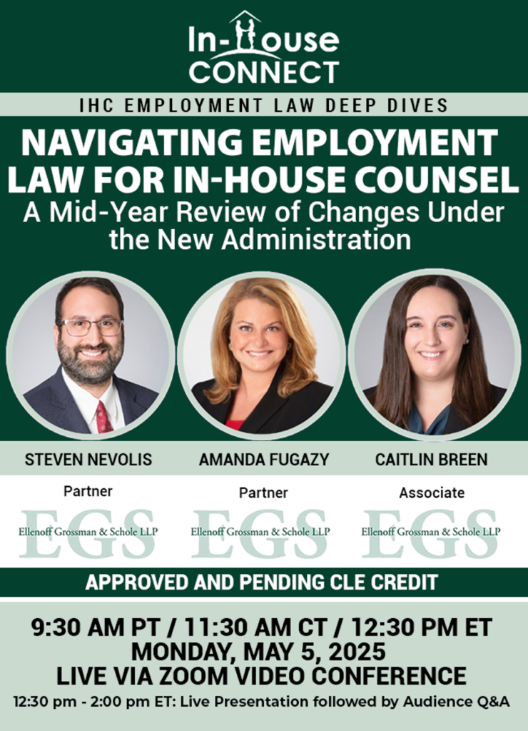 Join us on Monday, May 5, 2025, at 12:30pm ET / 9:30am PT as Amanda Fugazy, Steve Nevolis, and Caitlin Breen of Ellenoff, Grossman & Schole provide a mid-year review of key employment law changes under the new administration and what they mean for employers.