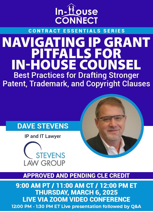 Join us on Thursday, March 6th at 12pm ET / 9am PT as Dave Stevens, IP and IT Lawyer at the Stevens Law Group, explores the key elements of IP grant clauses, common pitfalls to avoid, and best practices for contract drafters and negotiators to strengthen their agreements.