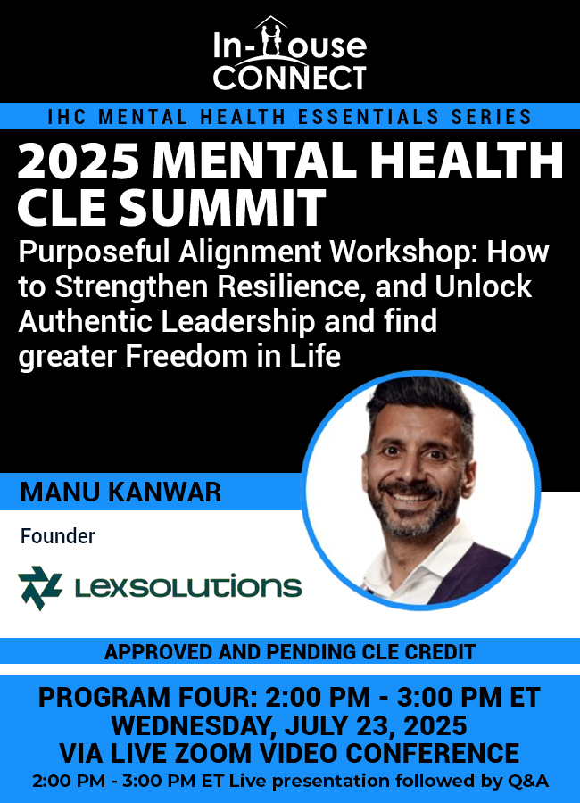 Join us on Wednesday, July 23rd from 2pm to 3pm ET for Program Four of the IHC x SpotDraft Mental Health CLE Summit as Manu Kanwar, former General Counsel, certified leadership and organizational coach, and founder of LexSolutions, guides you through an energizing session on resilience, narrative, and mindset. You will learn how to quickly realign when life pulls you off-center, shift from reactivity to intention, and align with the bigger-ticket issues that matter to you and your leadership.
