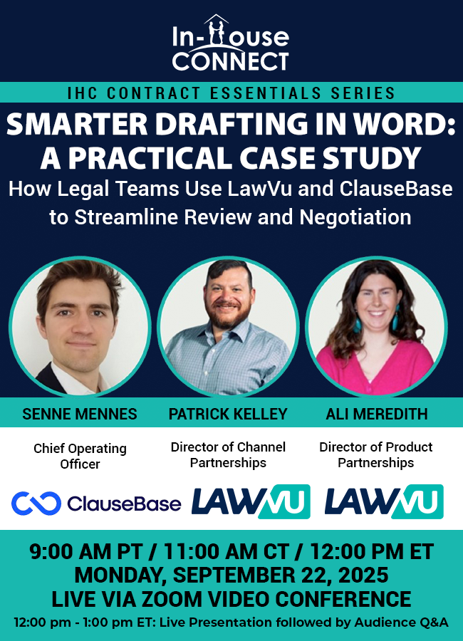This program is FREE thanks to our gracious sponsor, LawVu— The AI-powered workspace for in-house legal teams! If you can’t make it to the live program, the recording will be available for viewing via our paid CLE library, In-House Connect On-Demand!