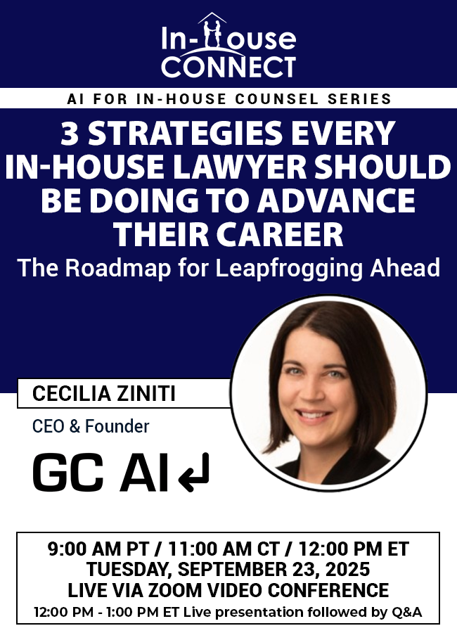 Join us on Tuesday, September 23 at 9:00 am PT / 12:00 pm ET for a live conversation with GC AI CEO Cecilia Ziniti, a 3x General Counsel and experienced in-house leader, who will share actionable career advice on how to increase your impact, raise your internal profile, and build the relationships that move your career forward.
