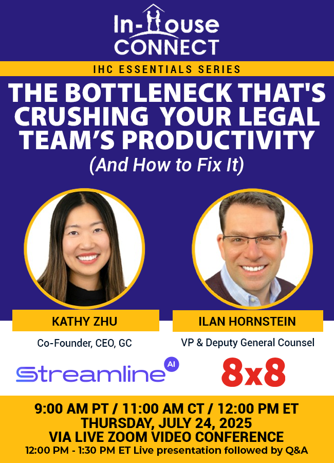 Join us on Thursday, July 24 at 12pm ET as Kathy Zhu, Founder and CEO of Streamline AI and former AGC at DoorDash, and Ilan Hornstein, VP & Deputy General Counsel at 8×8, break down exactly how in-house teams can eliminate low-value tasks, free up time for higher-impact work, and prove their worth across the business. This isn’t theory—it’s a step-by-step guide to reshaping how Legal operates and is perceived.