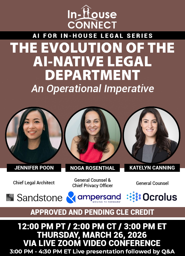 Join us on Thursday, March 26 at 3:00pm ET / 12 PM PT as Jennifer Poon, Chief Legal Architect at Sandstone, Noga Rosenthal, General Counsel and Chief Privacy Officer at Ampersand and Katelyn Canning, General Counsel at Ocrolus, explore what it means to build an AI-native legal department—not as a set of isolated tools, but as a restructured operating model with AI as a first principle. This CLE-eligible session will break down the difference between AI-augmented workflows and AI-native operating systems, and walk through the pillars that enable compounding efficiency: dynamic knowledge capture, integrated intake and visibility, and the right division of labor between human judgment and automated execution.