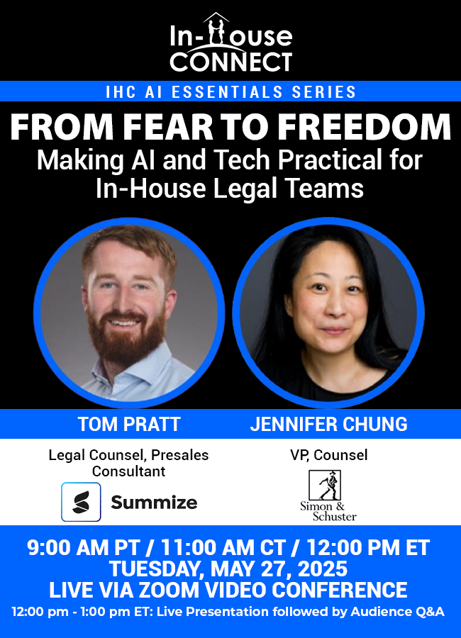 This program is FREE thanks to our gracious sponsor, LawVu! If you can’t make it to the live program, the recording will be available for viewing via our paid CLE library, In-House Connect On-Demand!