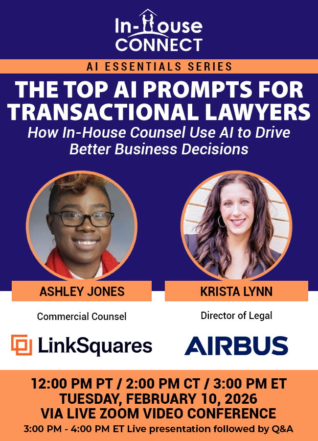 Join us on Tuesday, February 10th at 3:00pm ET/ 12:00pm PT, In this practical, no-hype webinar, Krista Lynn, Director of Legal at Airbus U.S., and Ashley Jones of LinkSquares walk through the AI prompts transactional lawyers actually use — and why they work. This session focuses on business decisions, not prompt engineering.