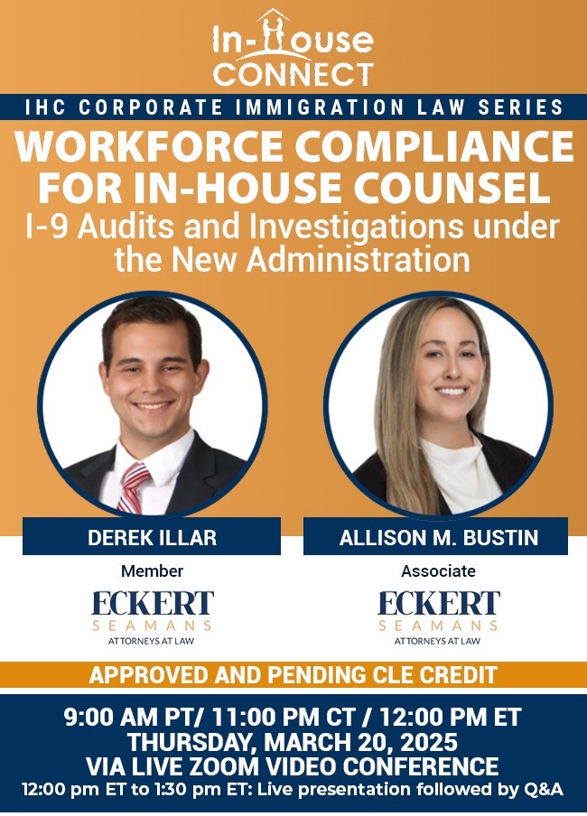 Join us on Thursday, March 20, 2025, at 12pm ET / 9am PT as Derek Illar and Allison Bustin of Eckert Seamans provide key insights on employer obligations, ICE audits, and best practices for ensuring compliance with federal immigration laws.
