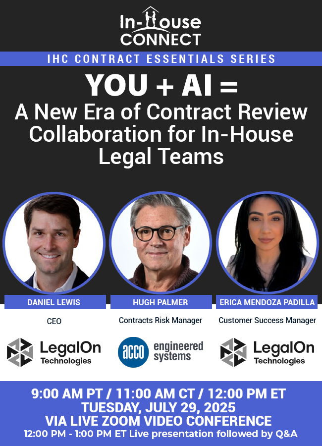 Join us on Tuesday, July 29th at 12:00 PM ET for an interactive webinar featuring Daniel Lewis, CEO of LegalOn, as he demonstrates how AI can transform your contract review process, and Hugh Palmer, Contract Risk Manager, ACCO Engineered Systems. This session will explore practical ways AI helps surface risk, suggest redlines, and generate summaries, enabling teams to collaborate efficiently without losing critical human oversight. You’ll also see a live demo of LegalOn’s powerful new AI contract review capabilities in action.
