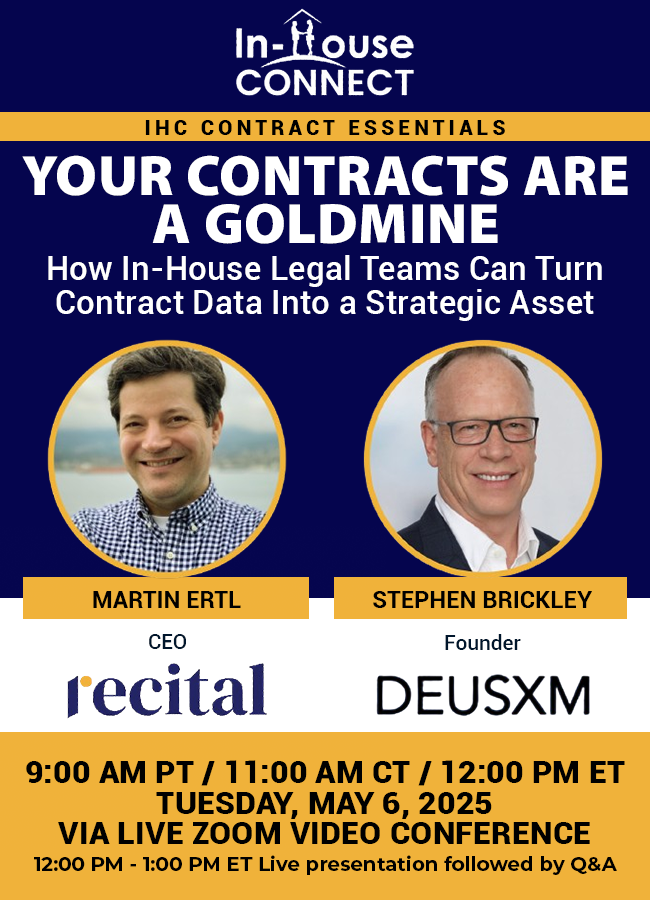 Join us on Tuesday, May 6th, 2025, at 12pm ET / 9am PT as Martin Ertl, CEO of Recital, and Stephen Brickley, founder of contract technology consultancy DeusXM, share a forward-thinking vision of contracts driven entirely by data. Hear how innovative legal departments are shifting their mindset, turning contracts from static archives into dynamic, actionable resources.